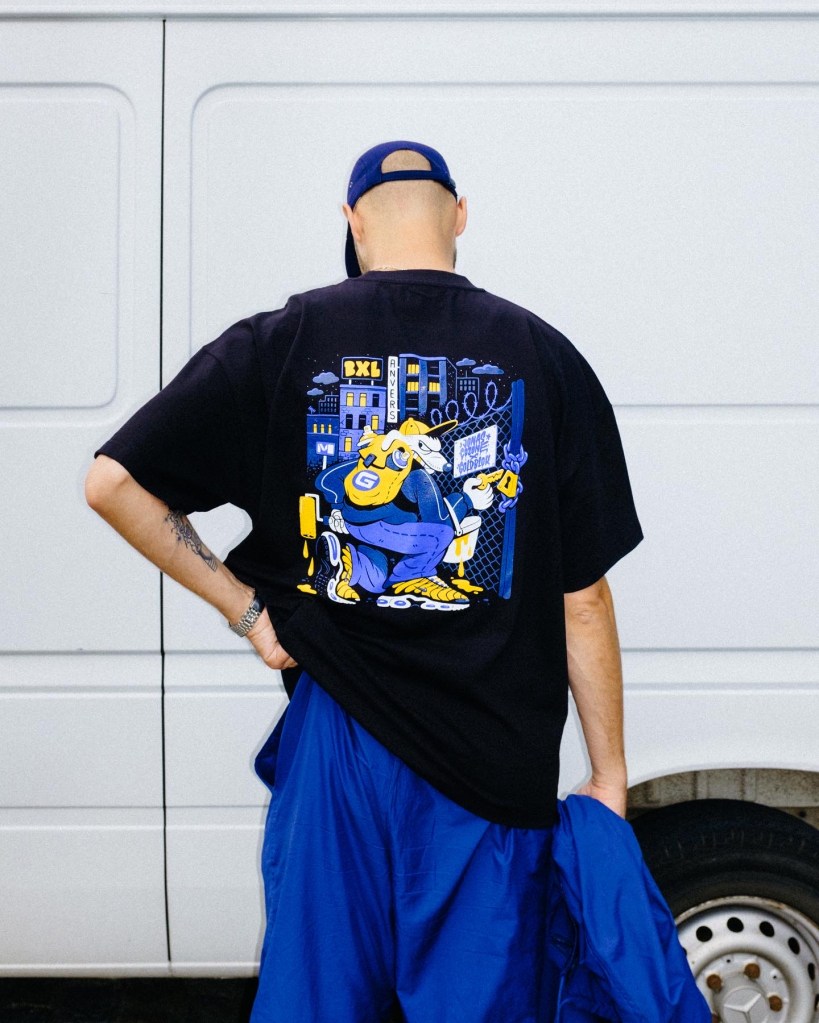 Je suis né dans le nord de Bruxelles. J’ai toujours été ici, je suis un produit du côté flamand de la ville. J’ai fait des études d’architecture à l’école de Saint-Luc, puis j’ai eu mon diplôme. En 2018 j’ai ouvert un resto oriental aux Marolles, une ASBL avec un associé, ça s’appelait Pois Chiche. L’aventure a duré deux ans, puis j’ai arrêté en 2020 : c’est là que je me suis persuadé qu’il fallait tout investir dans le textile, dans Goldblok. Au début, je faisais des petites releases par-ci parlà. Ouvrir un restaurant m’a montré que j’étais capable de faire le plus dur, à savoir créer sa structure, donc j’ai ouvert ma boîte Goldblok Garments.